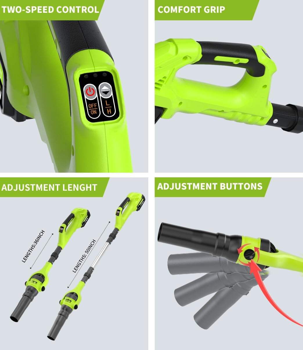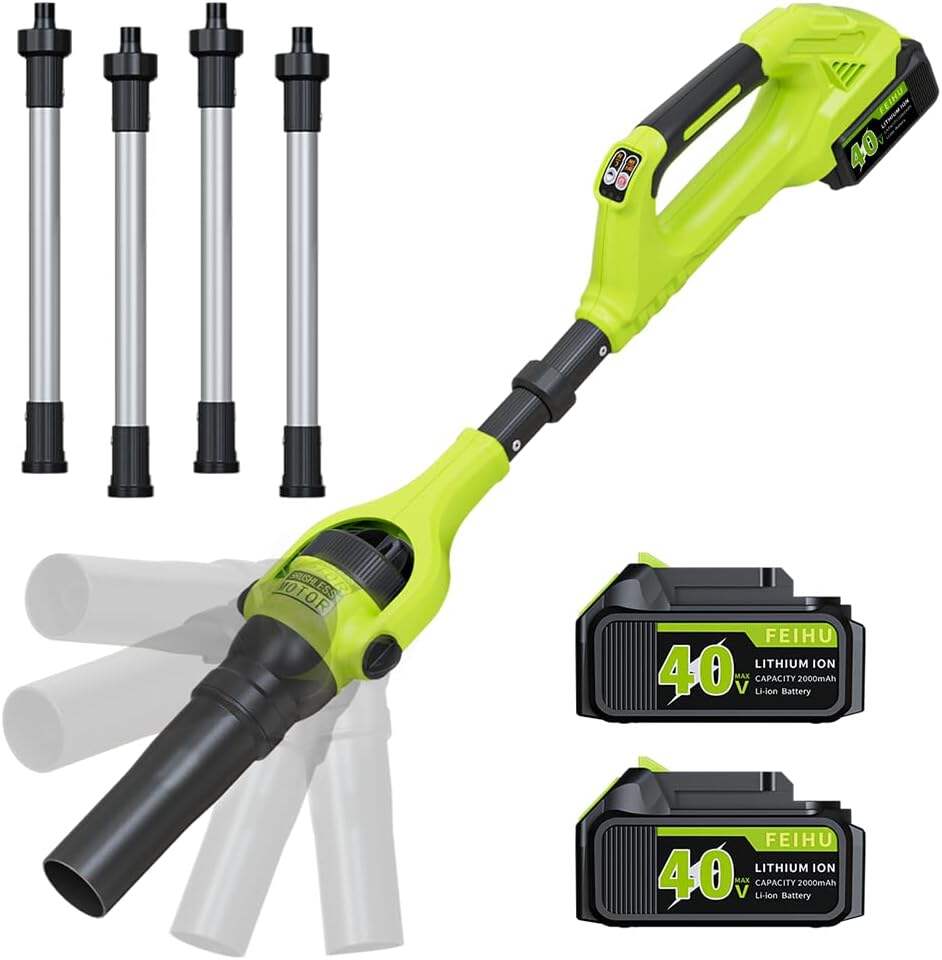 FEIHU Cordless Leaf Blower 40V - 580 CFM/180 MPH, Brushless Electric Blower with 2*2.0Ah Batteries & Charger, 2-in-1 Design with Gutter Cleaning Extension for Garden & Home - Green